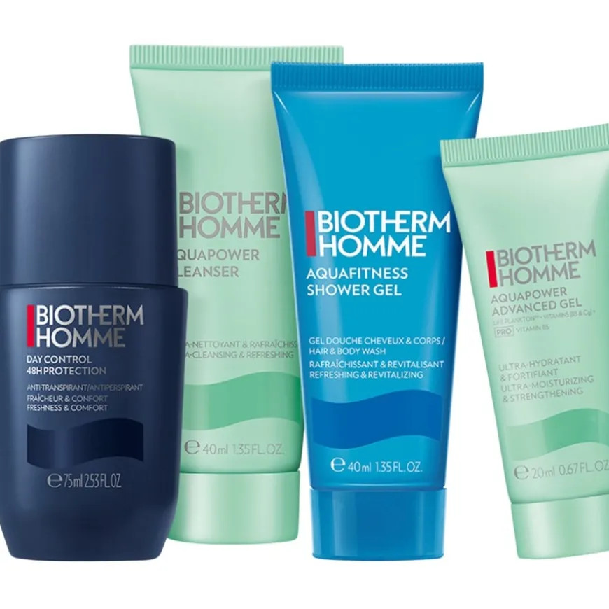 De Biotherm Homme Aquapower Power Drop Set bevat een uitgebreide selectie voor huid- en lichaamsverzorging in handige maten, ideaal voor onderweg. De set bevat de Aquapower Advanced Gel, een gezichtsverzorgingsproduct met een lichte textuur op waterbasis die de huidbarrière kan helpen ondersteunen. De Aquapower Cleanser, waarvan de gelformule verandert in een romig schuim bij contact met water, wordt gebruikt om het gezicht te reinigen. De Aquafitness Shower Gel voor lichaam en haar is verrijkt met mineralen uit de zee en geeft een fris gevoel. De routine wordt afgerond met de Day Control Roll-on Deodorant, een antitranspirant die tot 48 uur lang een aangenaam gevoel geeft en geen resten achterlaat op kleding. Alle producten worden geleverd in een herbruikbare, blauwe sportfles van 1 liter.