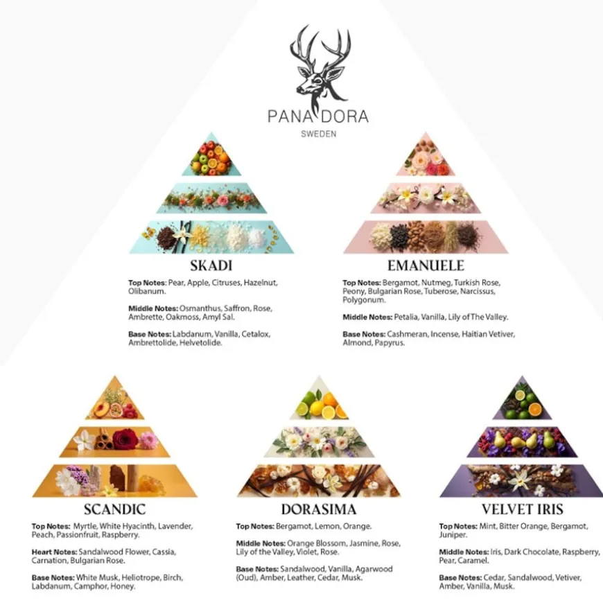 Scandic:Alcohol denat., Parfum, Aqua, Citrus Aurantium Bergamia Peel Oil, Jasminum, Officinale Oil, Lavandula angustifolia Oil, Rose Flower oil, Limonene, Pogostemon Cablin Oil, Pelargonium Graveolens Flower Oil, Rose Ketones, Alpha-isomethyl Ionone, Alphaterpinene, Benzyl Alcohol, Benzyl Salicylate, Trimethylbenzenepropanol, Eugenol, Geraniol, Geranyl Acetate, Hydroxycitronellal, Vanillin, Beta-Caryophyllene, Citronellol, Linalool, Linalyl acetate, Pinene, Tetramethyl Acetyloctahydronaphthalenes.