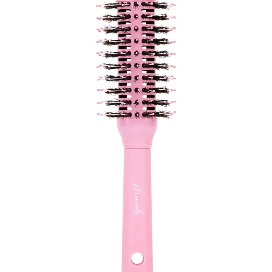 De ronde borstel met lange steel, die het cosmeticalabel Mermade Hair net als veel andere borstels en kammen heeft ontwikkeld voor de gevoelige hoofdhuid, maakt het haar glad bij het drogen met een haardroger. De hoofdhuid wordt zachtjes gemasseerd dankzij de dempingtechnologie, die te herkennen is aan de natuurlijk rubberen kogeltoppen op de nylon borstelharen. Je kunt je haar moeiteloos stylen met de Round Brush met of zonder warmte naar wens.
