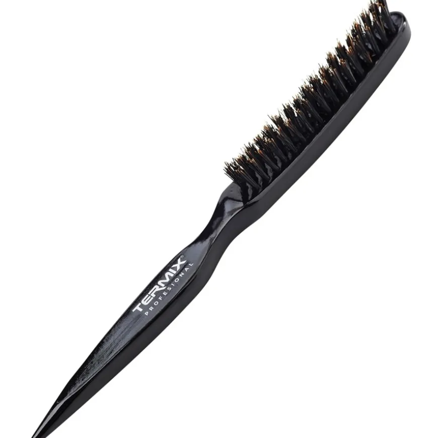 Voor precieze stylingresultaten bij de haarlijn is het kiezen van het juiste gereedschap cruciaal. De slanke tousle brush van TERMIX is speciaal ontwikkeld voor gedetailleerde stylingtechnieken. Het borstellichaam van echt hout ligt prettig in de hand en biedt de nodige stabiliteit voor gecontroleerd werken. Het bijzondere is de plaatsing van de zwijnenharen: twee verschillende lengtes maken het mogelijk om het haar specifiek vast te pakken en het meer structuur en volheid bij de haaraanzet te geven. Dit geraffineerde ontwerp maakt de borstel een handige hulp voor het creëren van volume. Het taps toelopende handvat is ook praktisch voor het netjes scheiden van afzonderlijke haarstukken. Dit creëert gedefinieerde looks met een professionele afwerking.