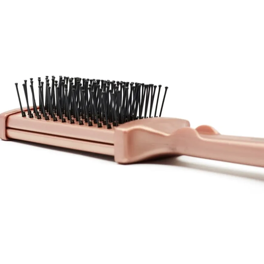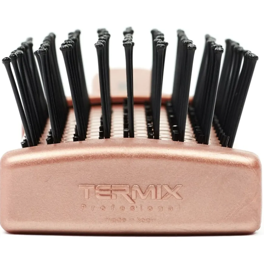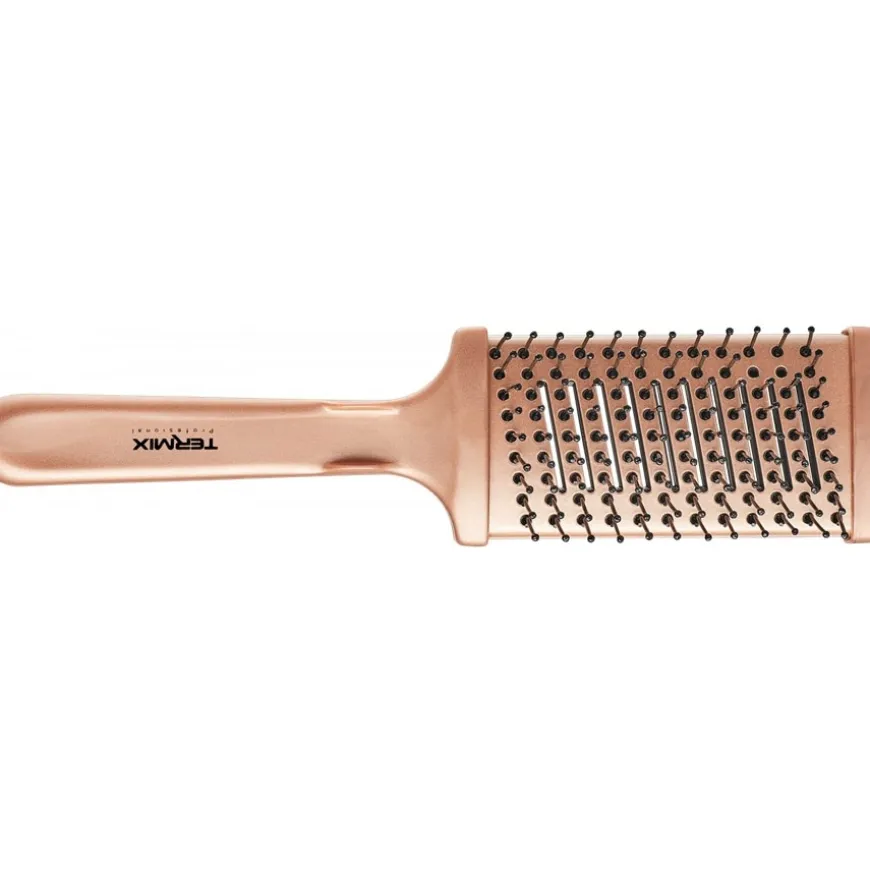 De Thermal Flat Brush Gold Rose van TERMIX is niet alleen een visueel hoogstandje. Dit roségouden model is uitgerust met speciale thermische platte borstels. Hiermee kun je het haar heel voorzichtig ontwarren. Door de coating glijden ze zonder veel wrijving door de afzonderlijke haarstukken. De tips zijn verzegeld. Hierdoor zorgt TERMIX ervoor dat de hoofdhuid niet geïrriteerd raakt. Tegelijkertijd heeft dit een positief effect op de levensduur van de tool.Platte borstels op de Thermal Flat Brush Gold Rose resulteren in glanzend, los haar. Het voelt heel licht aan na gebruik. De styling gaat langer mee. Hiervoor wordt keramische technologie gebruikt. Dit helpt om de temperatuur zo constant mogelijk te houden tijdens het drogen. Dit vermindert de effecten van warmte op de haarstructuur.