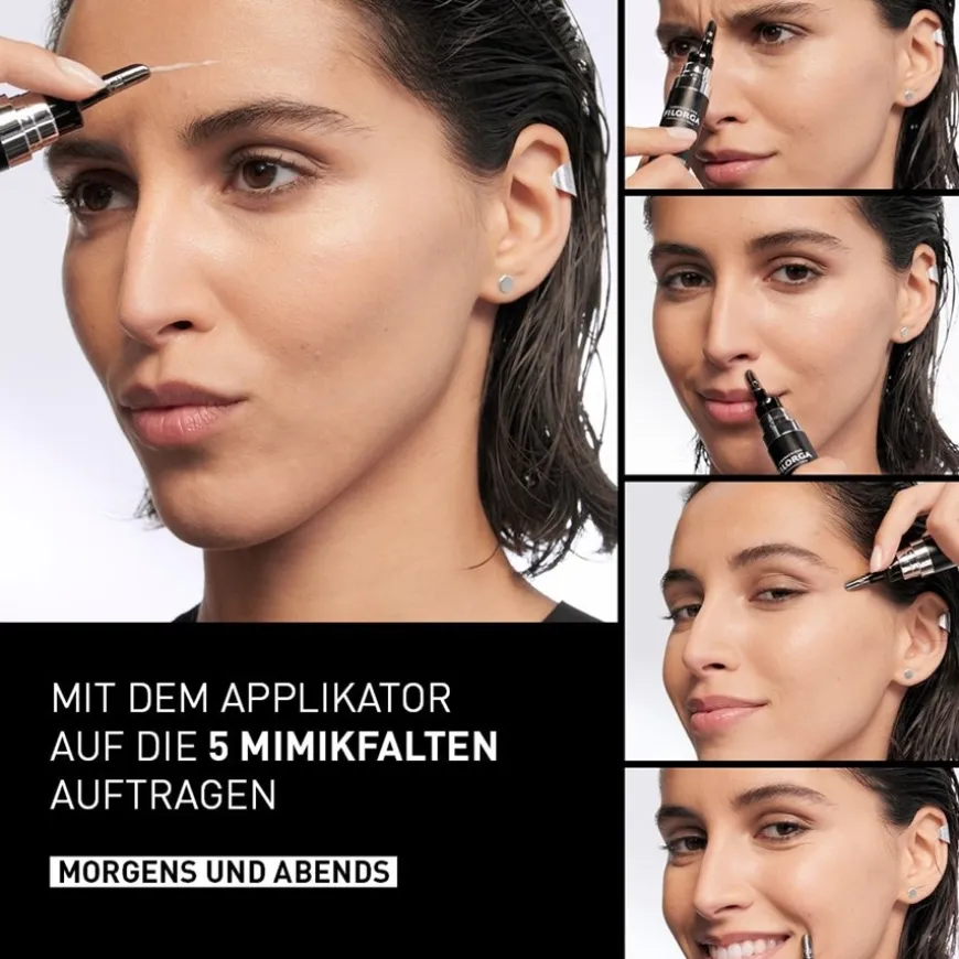 Het huidverzorgingsserum is bedoeld voor dagelijks gebruik ’s ochtends en ’s avonds. Breng na het reinigen van je gezicht een geschikte hoeveelheid van het product direct op de expressielijnen aan met behulp van de applicator. Masseer de witte geltextuur vervolgens zachtjes in de huid. De formule wordt snel geabsorbeerd en laat een lichte finish achter. Breng vervolgens een geschikte dag- of nachtcrème aan.