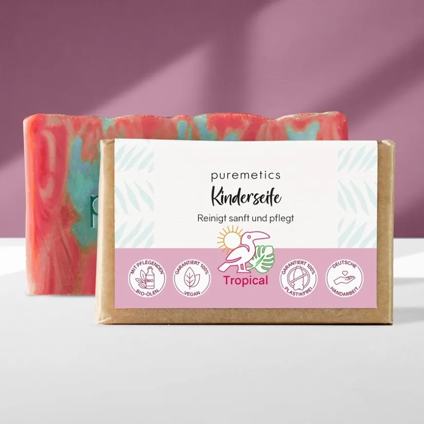 Jojoba-olie zorgt voor voldoende moisturisatie van de jonge huid, waardoor deze beschermd wordt tegen uitdrogen. Als de kinderhuid de neiging heeft om te vet te zijn, helpt de olie de olielaag van de huid te reguleren via de talgklieren, waardoor de huid er ook schoner uitziet. Sheaboter in de Tropical kinderzeep uit de puremetics natuurlijke zeeplijn voor huidverzorging bevat het ontstekingsremmende actieve ingrediënt allantoïne en extra voedingsstoffen en vitaminen voor de huid.