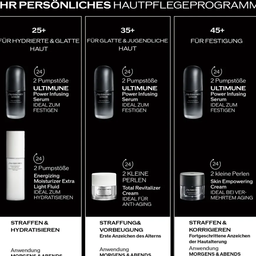 Het Ultimune Power Infusing Serum van Shiseido Men is een gezichtsserum gebaseerd op jarenlang onderzoek. Centraal in de formule staat het Power Fermented Camellia+ complex, een geconcentreerde mix van gefermenteerde Japanse camelia-extracten. Het serum wordt ’s ochtends en ’s avonds op de gereinigde huid aangebracht na de verzachter en vóór de gebruikelijke moisturizer. De samenstelling, die voor meer dan 91% uit ingrediënten van natuurlijke oorsprong bestaat, is geschikt voor alle huidtypes. Het is ook vrij van minerale olie en parabenen, dermatologisch getest en niet-comedogeen, wat betekent dat het de poriën niet verstopt. Het serum is ontwikkeld om ongelijkmatige teint, zichtbare poriën en een ongelijkmatige huidtextuur tegen te gaan. Het product wordt gepresenteerd in een elegante, donkere fles, waarvoor een praktische navuloptie beschikbaar is om plastic verpakkingen te helpen verminderen.