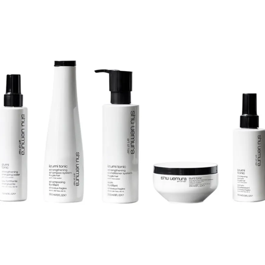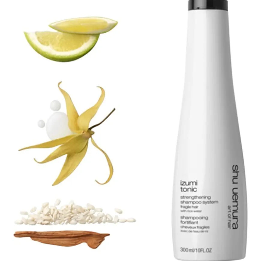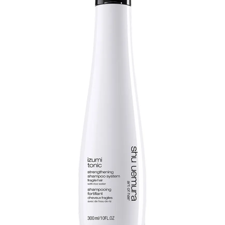Geïnspireerd door de Japanse traditie van haarverzorging met rijstwater is de Izumi Tonic Strengthening Shampoo van Shu Uemura ontwikkeld voor broos uitziend haar. De formule is gebaseerd op kostbaar rijstwater uit de regio Hyogo, dat rijk is aan aminozuren, vitaminen en mineralen. De shampoo reinigt de hoofdhuid en het haar op milde wijze zonder de natuurlijke vochtbalans aan te tasten. Het kan bijdragen aan een versterkt haargevoel en het haar dikker en voller laten lijken. Het haar wordt beter bestand tegen de dagelijkse stress die tot breuk kan leiden. De ervaring wordt afgerond met een verkwikkende geur van citrusnoten en een houtachtig muskusaccent. Voor een uitgebreid resultaat kan de shampoo gecombineerd worden met de conditioner en het serum uit het assortiment.</p